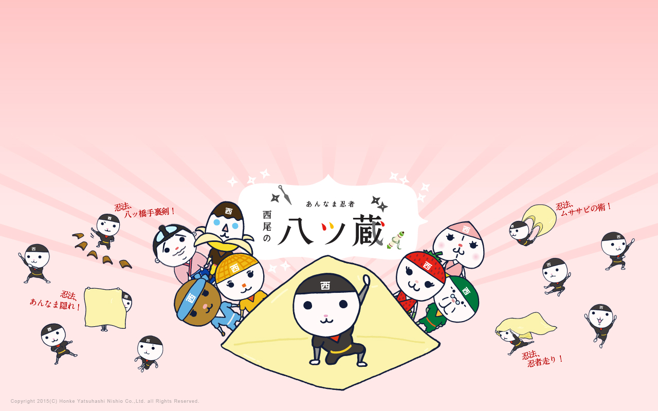 八ッ蔵でござる。 このページでは拙者や、ほかのあんなま忍者たちの壁紙を“だうんろーど”できるのでござる! ぱそこんでお仕事中、勉強中、ねっとさーふぃん中のみんな、ちょっと一息ついて壁紙を選んでみてほしいでござる! 壁紙の設定方法はこちら あんなま忍者とはち集合! 大きいサイズ(1920×1200) 小さいサイズ(1280×800) あんなま忍者集合! 大きいサイズ(1920×1200) 小さいサイズ(1280×800) エイプリルフール 大きいサイズ(1920×1200) 小さいサイズ(1280×800) 春の香り 大きいサイズ(1920×1200) 小さいサイズ(1280×800) ホワイトデー 大きいサイズ(1920×1200) 小さいサイズ(1280×800) バレンタインデー 大きいサイズ(1920×1200) 小さいサイズ(1280×800) たそがれ 大きいサイズ(1920×1200) 小さいサイズ(1280×800) 八ッ蔵の寝床!? 大きいサイズ(1920×1200) 小さいサイズ(1280×800) 今年もよろしくでござる 大きいサイズ(1920×1200) 小さいサイズ(1280×800) 秘術 あんなま隠れ 大きいサイズ(1920×1200) 小さいサイズ(1280×800) お庭で発見 大きいサイズ(1920×1200) 小さいサイズ(1280×800) 八ッ蔵とかき氷 大きいサイズ(1920×1200) 小さいサイズ(1280×800)